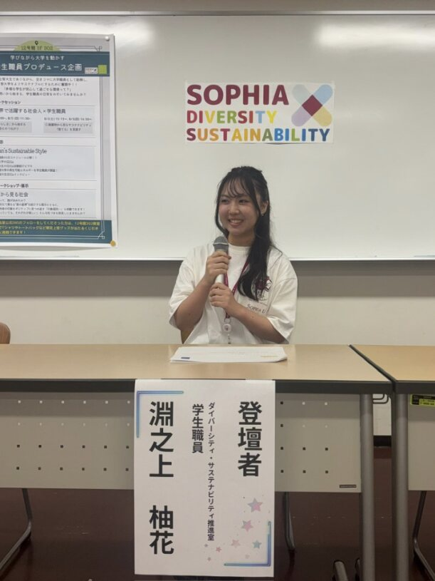淵之上さんは、難民支援団体「Sophia Refugee Support Group」では食料配布委員会の一員として活動し、日本に暮らす難民の方々への食の支援を行っています。また、上智学院ダイバーシティ・サステナビリティ推進室の学生職員として、学内のフードダイバーシティ向上にも尽力しています。現在は株式会社セブン‐イレブン・ジャパンとの共同プロジェクトを通じて、アレルギーや宗教、文化的背景に配慮した商品や環境の整備に取り組み、誰もが安心して食に辿り着けるキャンパスづくりを目指しています。