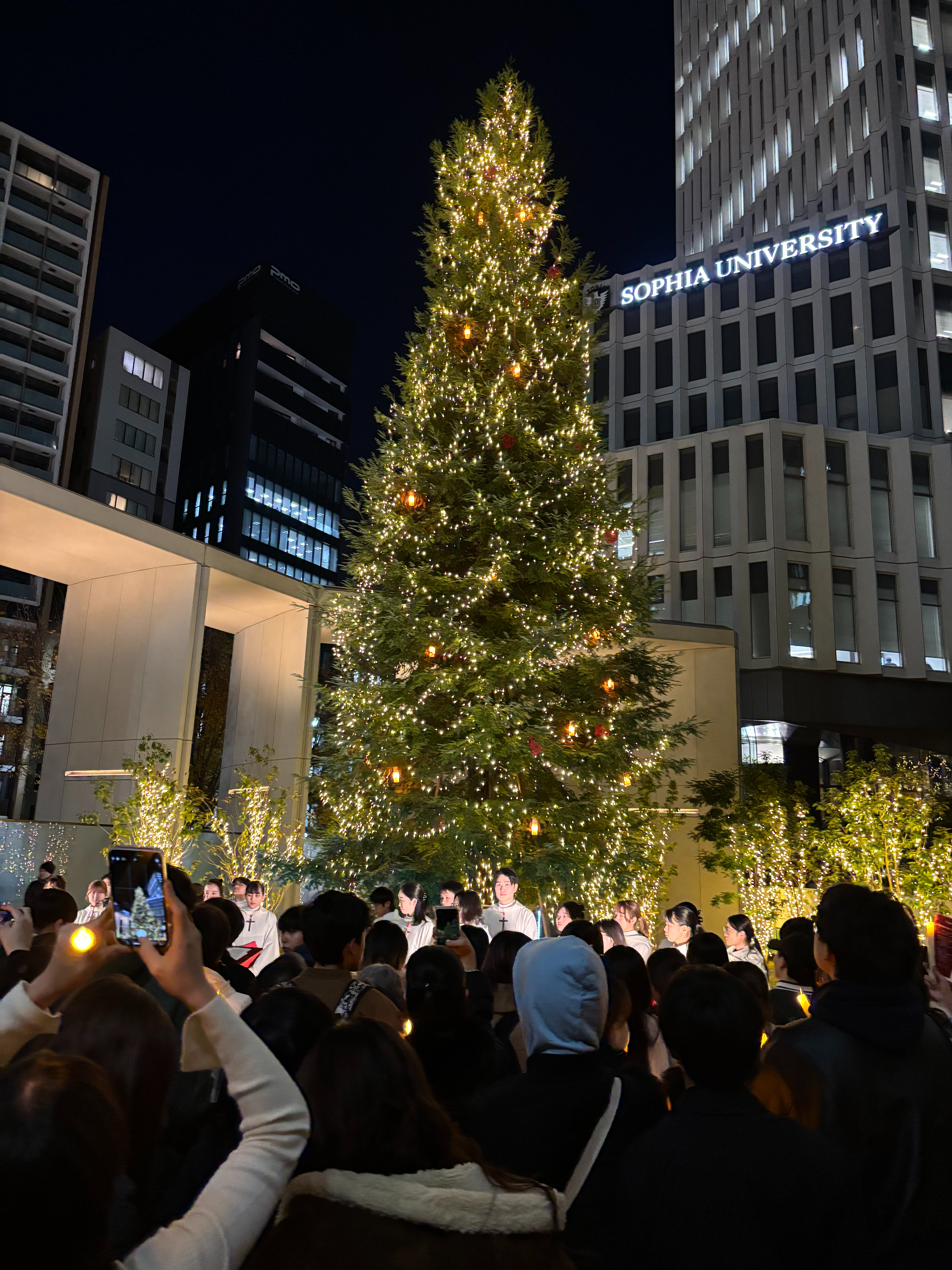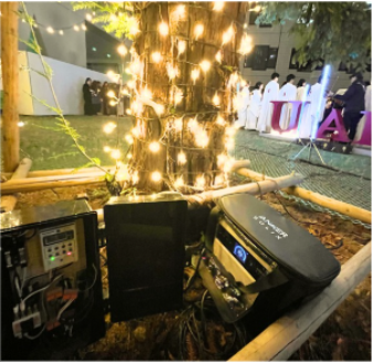 また、今年のクリスマスツリーの点灯式では、事前に太陽光で蓄電した電力を使用し、点灯式を含む当日の約2時間を太陽光で学内で自給自足で生み出した電力でまかなうという、上智大学として初の試みも行いました。当日は、「Christmas Square」にも、充電スポットとして出展し、多くの学生がスマホを充電していました。